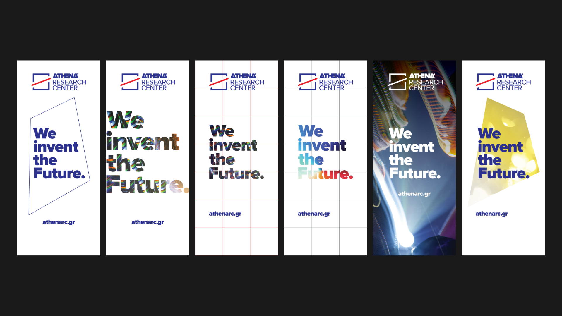 Ενδεικτικές συνθέσεις των στοιχείων οπτικής ταυτότητας του ΑΘΗΝΑ σε κάθετο format.
